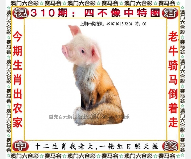 310期:四不像玄机解六肖12码开:虎16准 ①图解特肖:虎鼠猪狗兔马 |